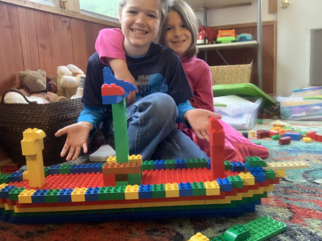 Andrew and Anna building a boat with duplos