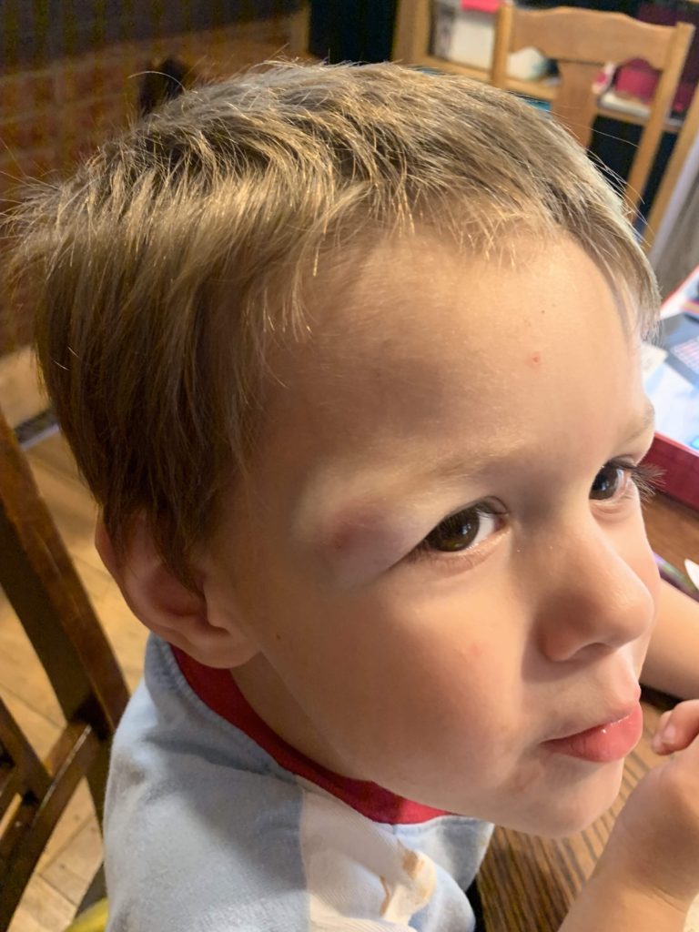 Next are pictures of Asher, who gave himself a pretty bad black eye, poor guy. He bent over by the toilet to pick up his shoes, and bonked the corner of his eyebrow on the toilet. It was a big goose egg to start, but it’s healing quickly!