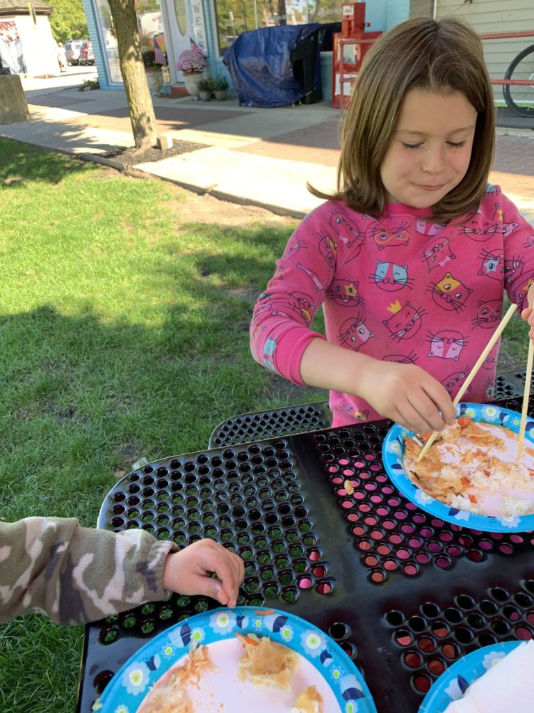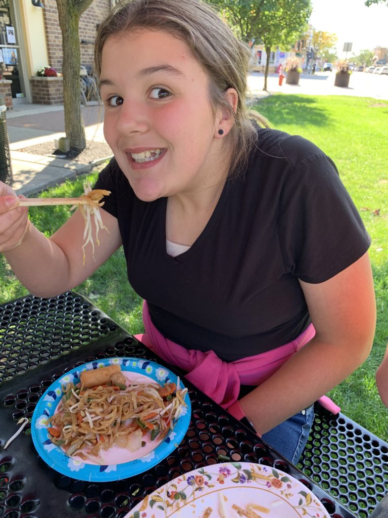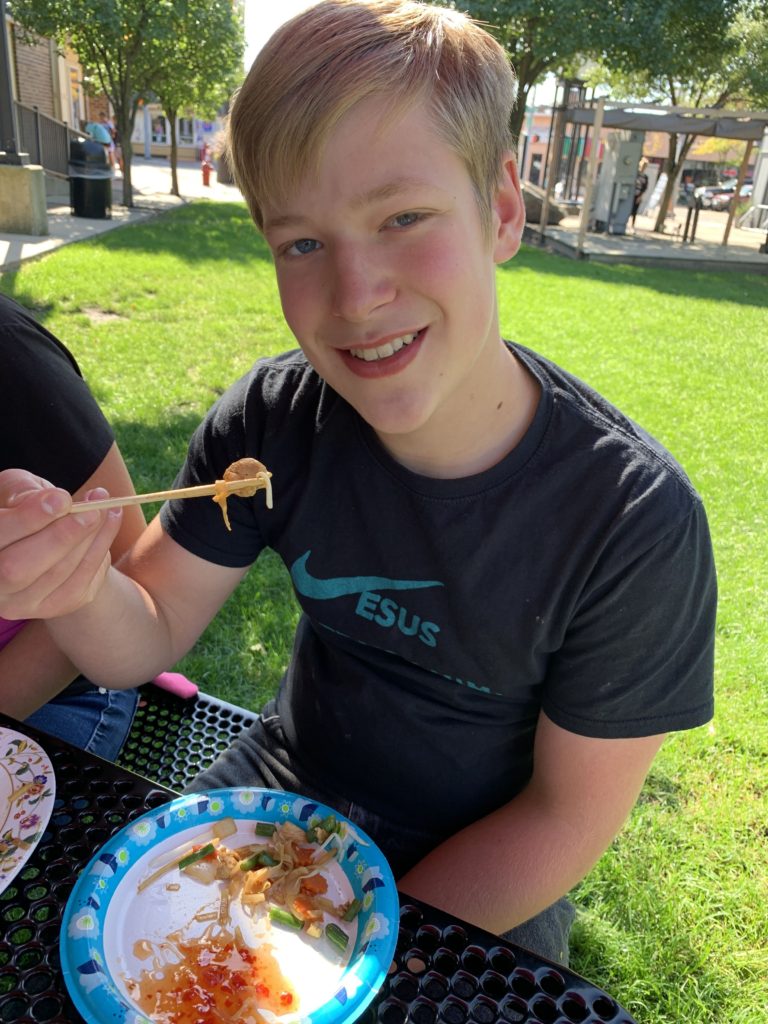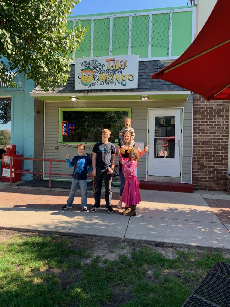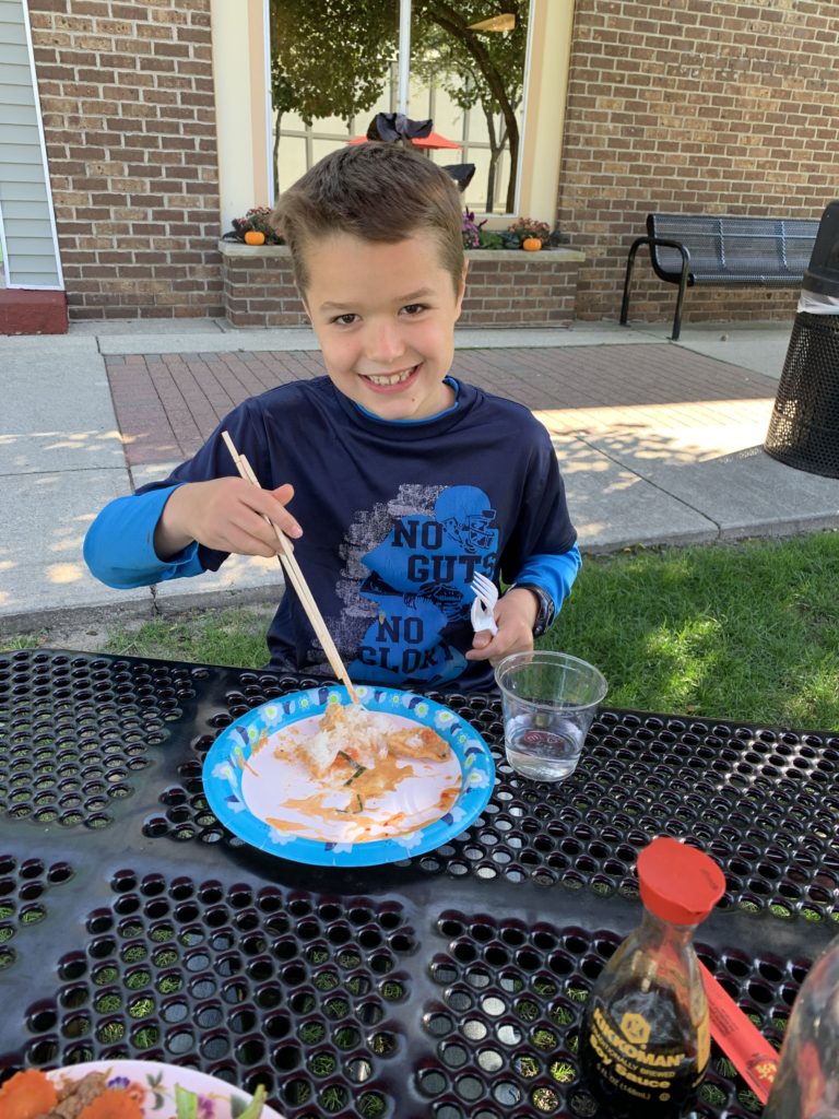 We spent October 1 at our local public library, aka our homeschool remote location. For lunch, we had a homeschool cross-cultural adventure by visiting a local Thai restaurant. It was the first time we’d tried Thai, and for the most part, we liked it. We were able to talk to the cook about Thai food. He gave us advice on what to try. Everything was so yummy. We all tried using chopsticks (except Asher) and had fun getting the hang of it, some more quickly than others.