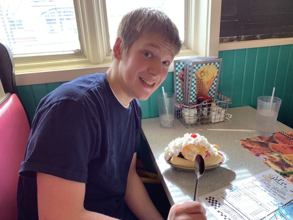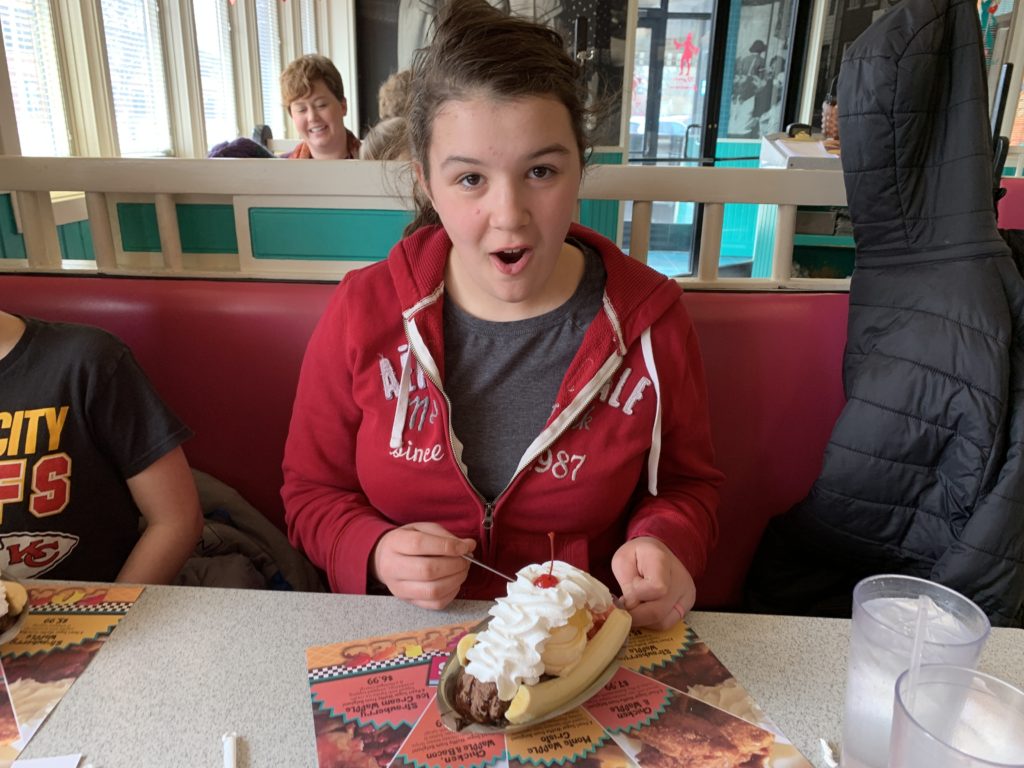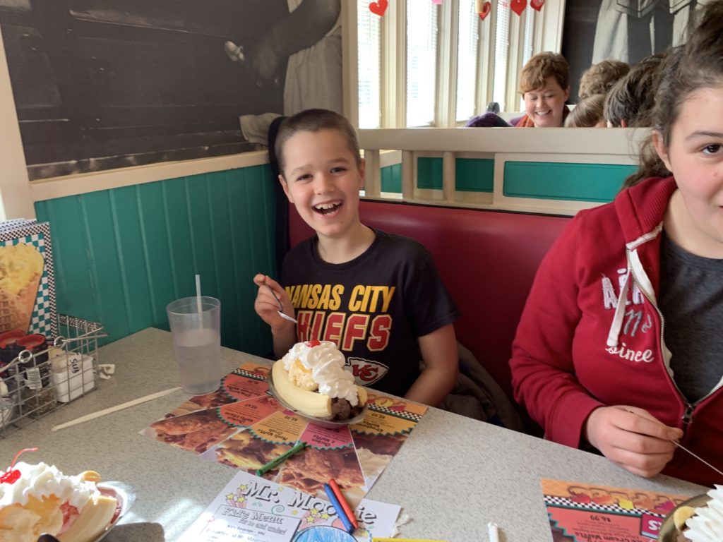 This past week was a fun one, filled with a lot of firsts for the kids. To start, below are three pictures of the older three kids eating giant banana splits. Before they left for Spring Hill two weekends ago I begged them to not eat too much junk food. Josh ended up promising them each a banana split if they could refrain from any desserts, sugary drinks, and candy of all kinds, shapes and sizes. With a little encouragement and mutual watchfulness, the kids did just that, so Josh took them out for banana splits. After seeing these pictures though I am wondering if the kids got the better end of the deal. Those banana splits are HUGE! They might as well have gone ahead and eaten the junk food at Spring Hill. Josh argued that these at least have fruit in them. Mm-hmm.