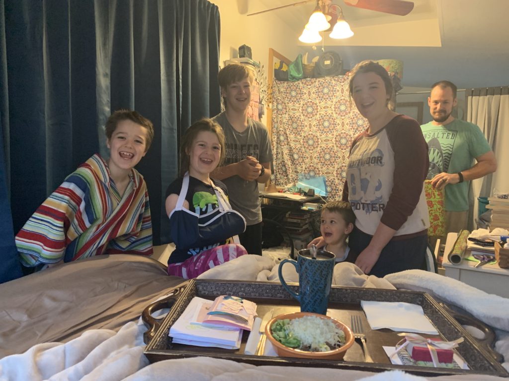 Here are some fun pictures of us killing time in the ER while they decided how to proceed. She is such a trooper, not a single tear or complaint. It’s moments like these that make me even more thankful for my kids. I am so blessed to be their mother. Which naturally leads me into Mother’s Day. Below is a picture of the kids first thing in the morning crowding around with breakfast and cards and COUPONS! Woot woot! I love me some good coupons, mm-hmm. I already used several today. The kitchen floor is now mopped, the living room is now vacuumed, and Anna has been reading books and playing games with Asher. It’s such a joy to have such great kids.