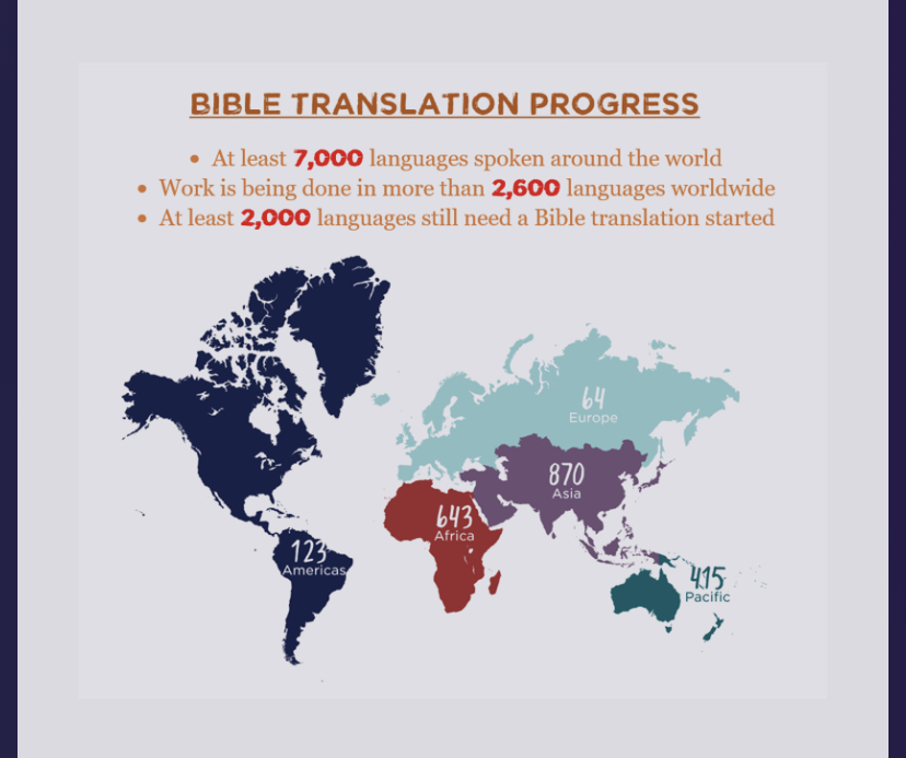 In this day and age of modern technology, which connects the world, it’s hard to believe that there can still be languages left waiting for God’s Word to be translated. But did you know out of the 7,000+ languages in the world, that over 2,000 languages have none of God’s Word? Not a book, not a chapter, not even a single verse no word of God’s message has been translated in these languages. Below is a map showing the various regions of the world and the number of languages in each region that are still waiting.