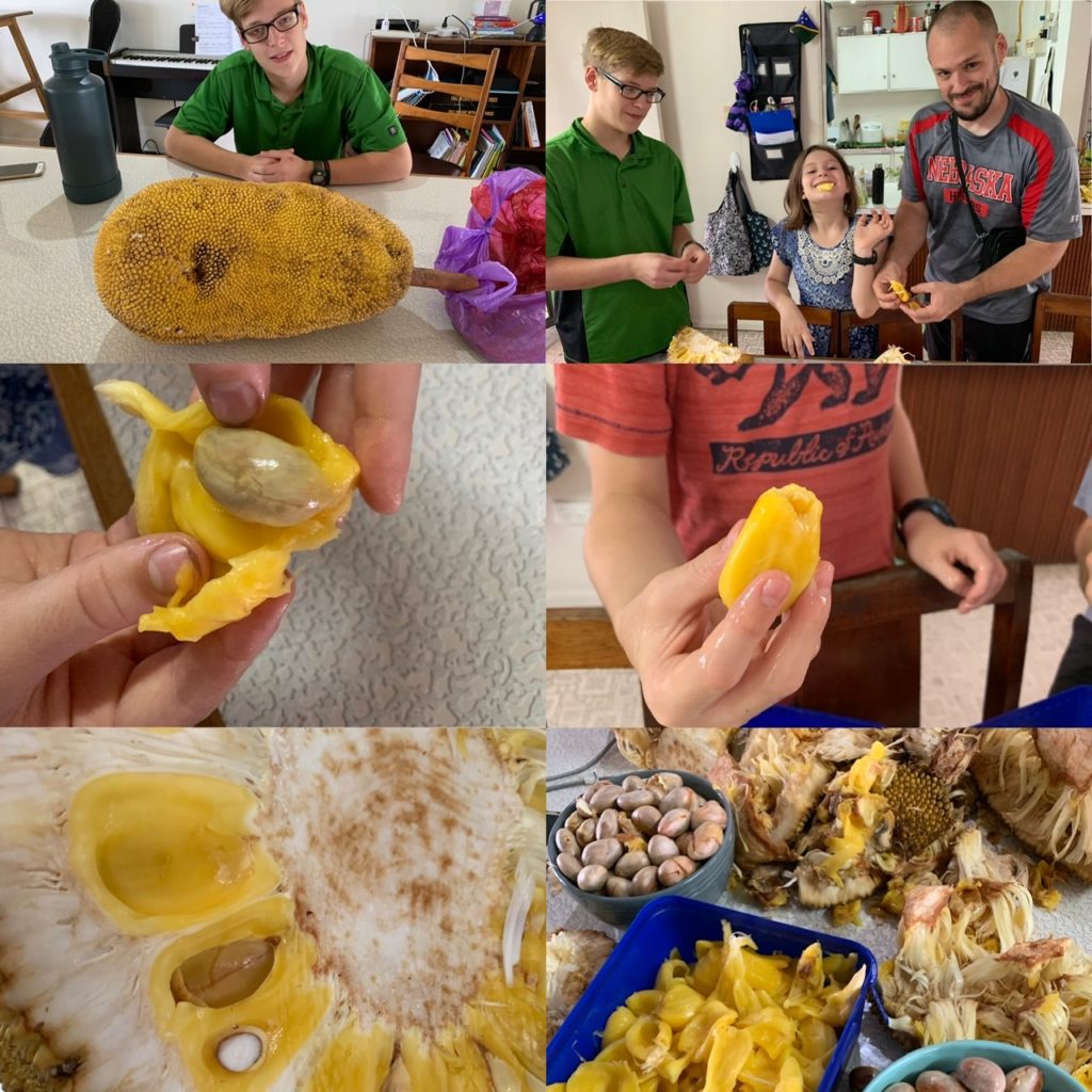 These pictures represent one very courageous woman! I take a trip into the Central Market once a week. Using only Pijin I try to purchase a week’s worth of fruits and vegetables for our family of seven. I must carry anything I purchase. I usually carry as much as I can, then make a trip to the car, drop off my purchased produce and head back in to get more. I spotted this particular item, a Jackfruit, in the middle of the huge market. I walked to the seller and asked what it was, how to cut it, and how to eat it, all in Pijin. I eyed the big fruit, trying to decide if it was worth lugging to the car, where I was sure to have many people stare at me as I did it. I told the seller I might be back, and looked for the rest of the items on my list. As I was heading to the car to drop off another load I decided to go for it! I bought the giant fruit and hefted it on to my shoulder. As I walked out of the market I held my head high and cracked a giant smile on my face. I am thankful for God’s Spirit inside me and Jesus’ promise to always be with me. I am learning to laugh at myself as I try new things, hopefully inviting those around me to laugh with me instead of at me.