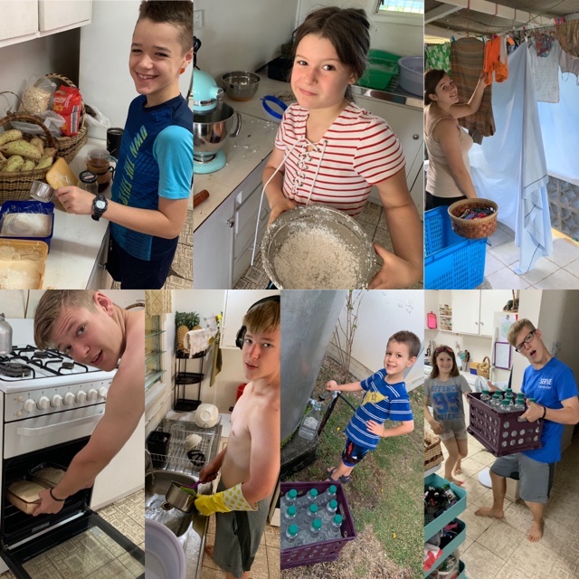 With meals comes chores of course, so I’ll dive into that next. Everyday each family member has about four family-care chores they do (in addition to their normal personal-care chores like making their bed and brushing their teeth). These mostly consist of the following: cleaning up after a meal, filling rain water bottles from the rain tank (used for cooking and cleaning), hanging clothes on the line, bringing clothes in from the line, sorting clothes to be put away, dumping the compost bucket, dumping the “rubbish” bucket, feeding the sourdough starter, making sourdough bread, making yogurt, and “scratching” coconut (used for making coconut milk which we use in smoothies and cooking “soup soup”).
