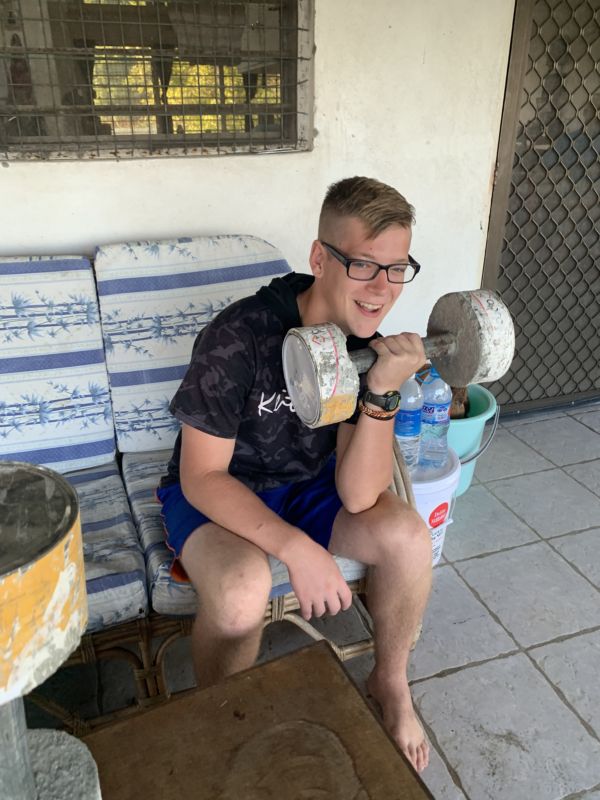 For school this year, I asked the three teens to get up at 6:30 in the morning and do a little work out every morning. Aaron was excited to get to use his weights he had just made during the summer.