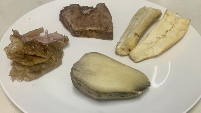 What it looked like served up. From left to right: pikpik (roasted pig) swamp taro, casava, kumara.