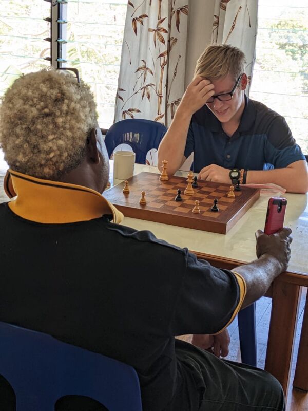 Aaron has helped start a ♟chess club♟ on SITAG campus. They meet twice a week in the evenings and at Tea Break a game or two will commence. In the above picture, they aren’t actually playing chess, they are playing “Kings” (like checkers) and Aaron is getting spanked!