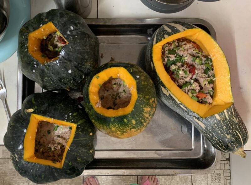 I really love to cook! It is so fun to find yummy things to make with the market goods we find. Pictured here is stuffed pumpkin, my version of a classic Motu recipe here in the Solomons. Here in the Solomon Islands 🇸🇧 they use a motu (outside earth oven) to cook pumpkin with tuna, green onion, and fresh squeezed coconut 🥥 milk inside. It is so yummy!