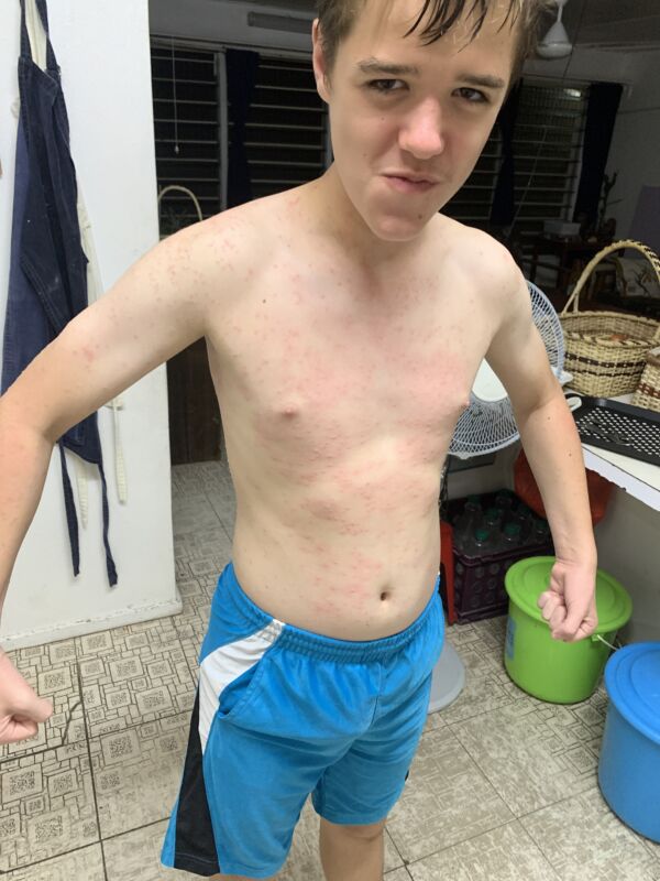 Aaron and Andrew went with the youth group to the beach on Saturday. They had a great time! Unfortunately, millions of tiny jellyfish also went to that particular beach! Aaron decided to stay out of the water most of the time, and came away with only a few stings. Andrew, on the other hand thought the water fun was worth the little stings he was feeling. 2 days later he may or may not be regretting his choice. 😬
