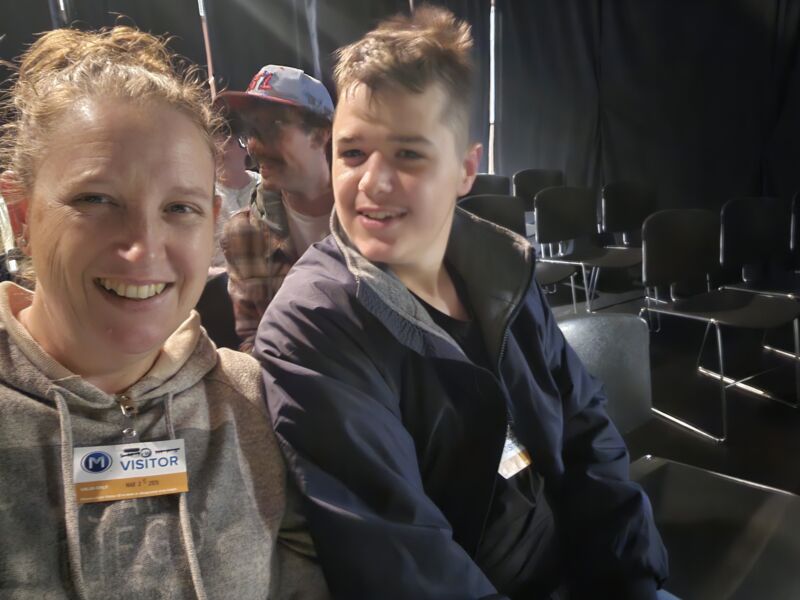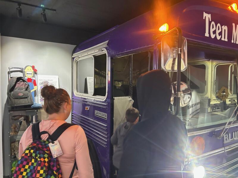 Below, Asher is pretending to drive one of the buses that was used to transport kids. They had the front part of it cut and put on display with everything else. The kids had fun playing in there for a bit, opening and closing the door, turning the big wheel. (Side note: 29 years ago this June, I would have ridden on a bus much like this one, from California all the way to Florida, picking up teens along the way.)